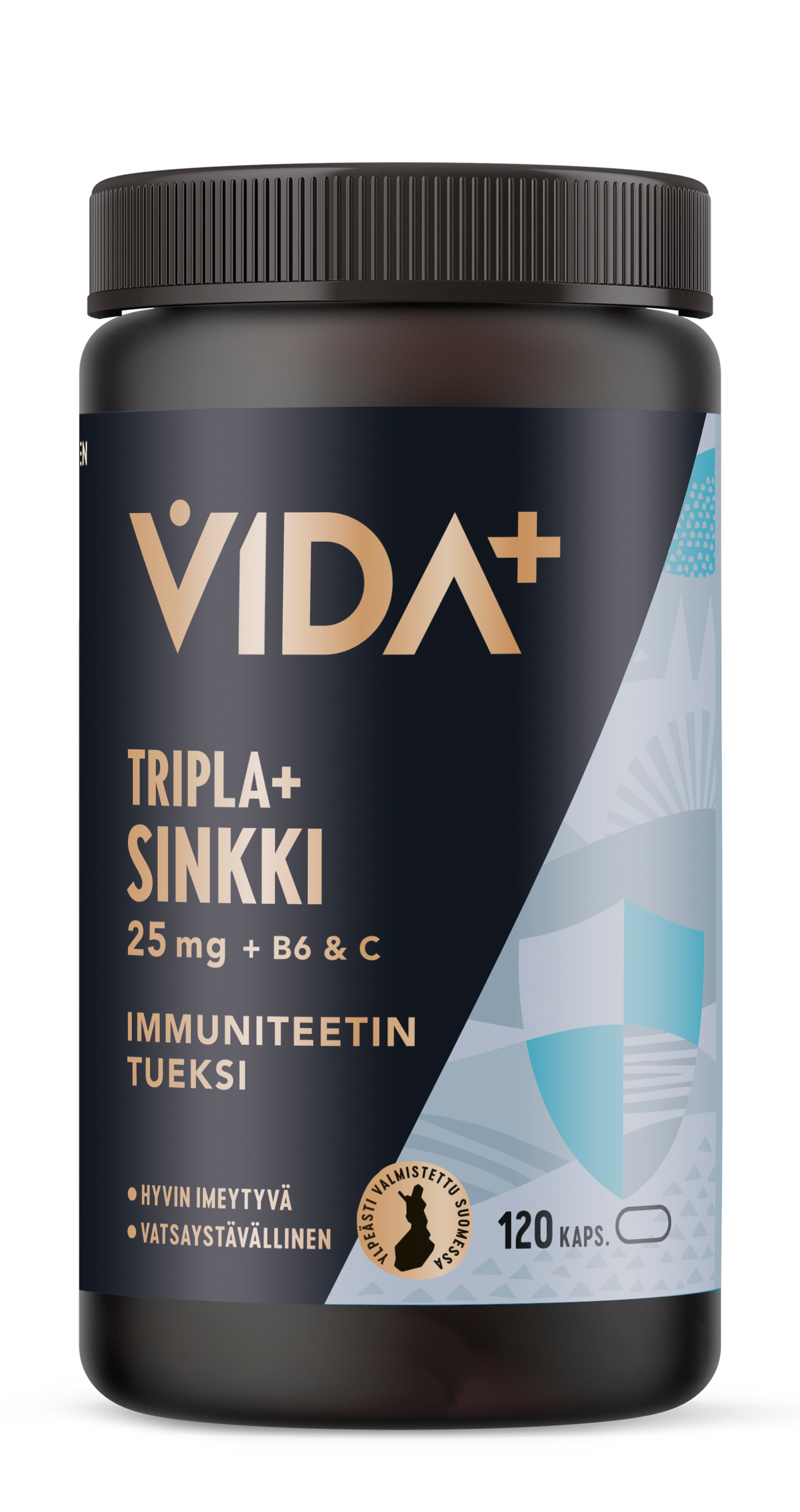 Hyvin imeytyvä ja vatsaystävällinen Vida plus -sarjan Tripla+ Sinkki 25 mg + B6- ja C-vitamiini edistää immuunijärjestelmän normaalia toimintaa ja ihon hyvinvointia. Vida plus -sarjan Tripla+ Sinkki 25 mg + B6- ja C-vitamiini sisältää kolmea tehokkainta orgaanista sinkin muotoa; sinkkipikolinaattia -bisglysinaattia ja -malaattia sekä C-vitamiinia että B6-vitamiinia. Sopii myös vegaaneille. Ylpeästi valmistettu sertifioidun laadunvalvonnan alla Suomessa.