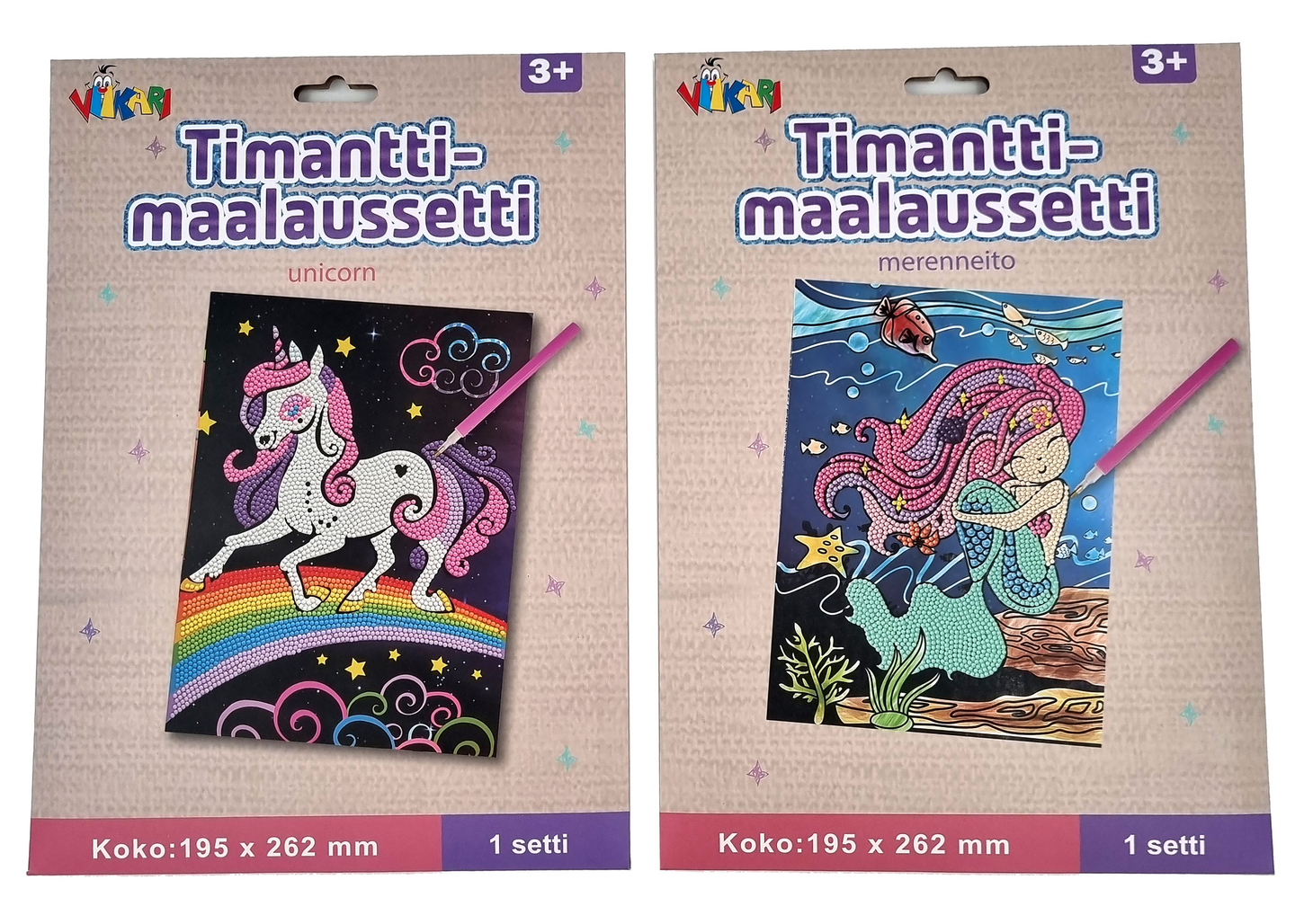 Viikari A4 Timanttimaalaussetti Unicorn & Merenneito. Sisältö: 9 timanttipussia, timanttiliima, aluslevy, esipainettu liimapintainen kuvapohja, timanttikynä. Huom! Verkkokaupasta tilattaessa ei valitettavasti voi valita versiota.