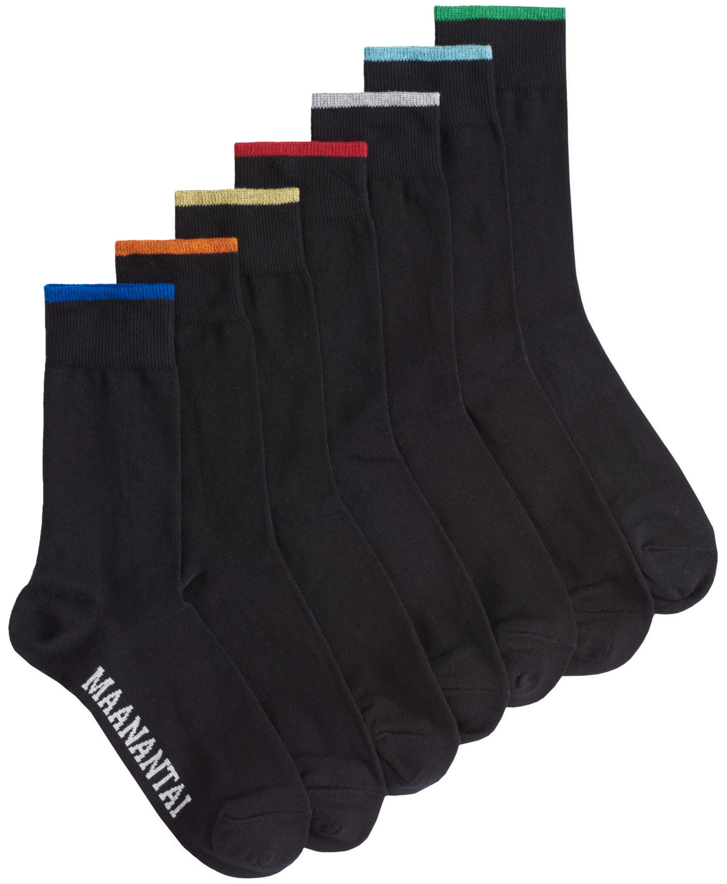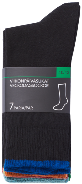 Nilkkasukat puuvillasekoitetta, pakkauksessa 7 paria sukkia. Sukat nimettynä jokaiselle viikonpäivälle maanantaista sunnuntaihin.
