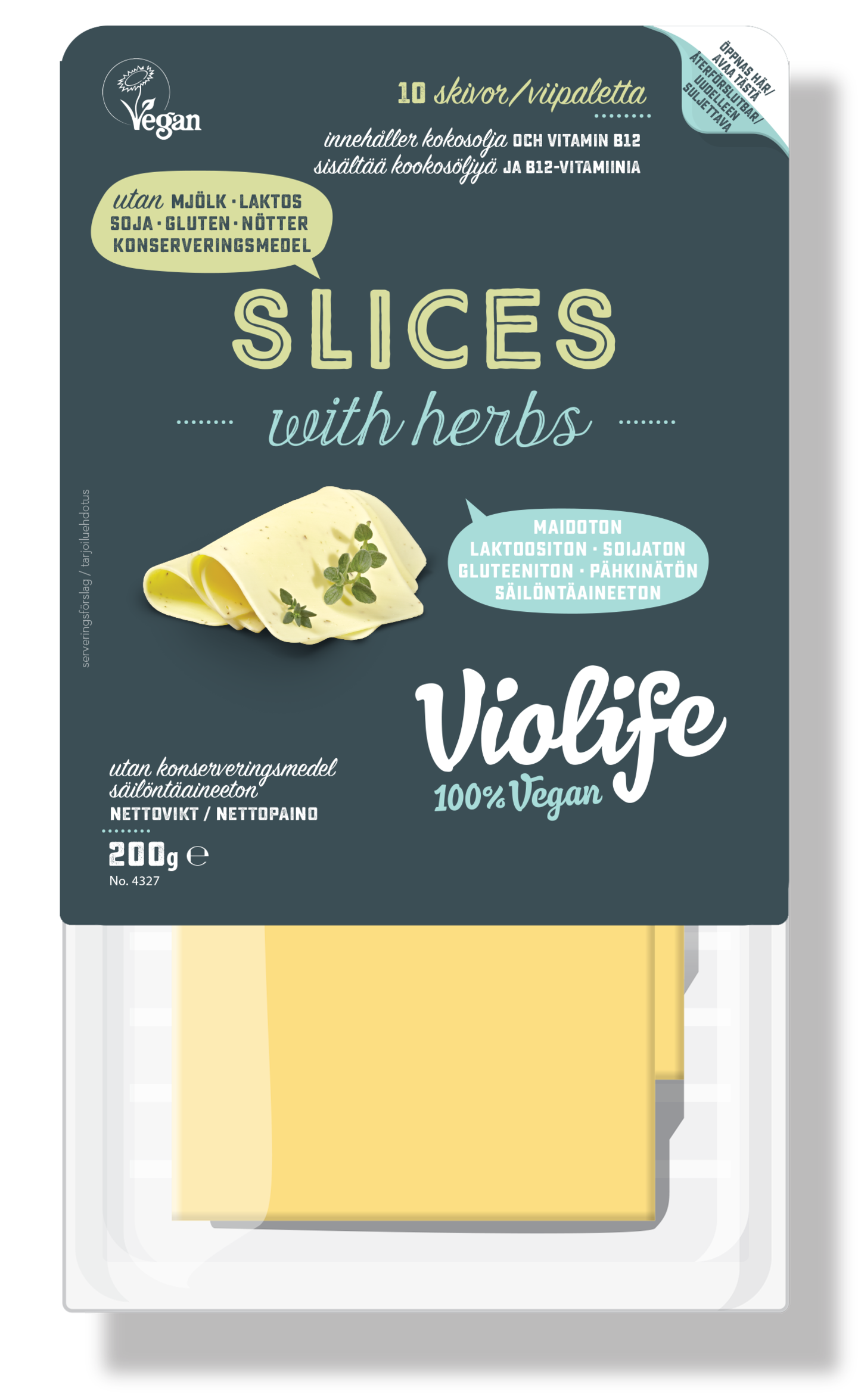 Erinomainen 100% kasviperäinen vaihtoehto juustolle. Yrtinmakuinen. Viipaleet. Sopii vegaaneille, vegetaristeille ja erikoisruokav aliota noudattaville. Ei sisällä maitoa, laktoosia, soijaa, gluteenia, säilöntäaineita.