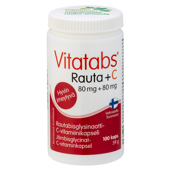 Vitatabs RAUTA + C sisältää rautaa orgaanisena bisglysinaattina (Fe2+). Hyvin imeytyvä, vatsalle ystävällinen ja lisäaineeton rautavalmiste, joka sisältää myös raudan imeytymiselle ja hyväksikäytölle tärkeää C-vitamiinia. Rauta edistää punaisten verisolujen ja hemoglobiinin muodostumista sekä hapenkuljetusta kehossa ja immuunijärjestelmän normaalia toimintaa. Se myös auttaa vähentämään väsymystä ja uupumusta. Riittävä raudansaanti on erityisen tärkeää naisille, raskaana oleville ja imettäville äideille, kasvuikäisille, urheilijoille ja kuntoilijoille, kasvissyöjille, laihduttajille, toipilaille sekä vanhuksille. Annostus: 1 kapseli päivässä. Laktoositon, hiivaton, makeuttamaton, gluteeniton ja sopii vegaaneille. Valmistettu Suomessa. Valmistuksessa ei ole käytetty fossiilisia raaka-aineita.