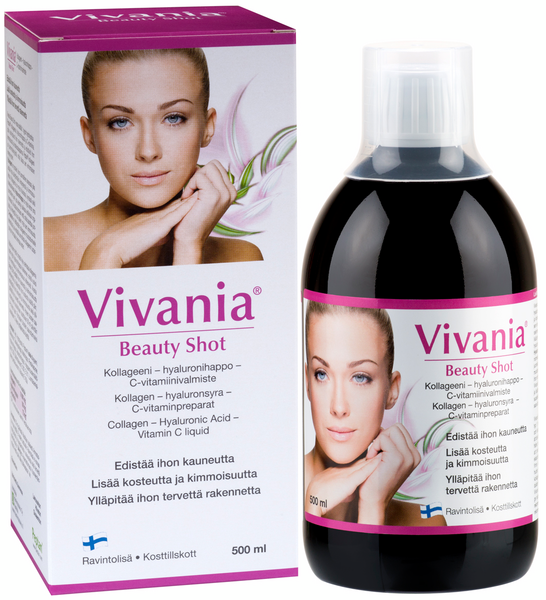 Vivania Beauty Shot -neste sisältää 1. tyypin hydrolysoitua Peptan® kollageenia, hyaluronihappoa ja C-vitamiinia, jotka vahvistavat ihon rakennetta ja edistävät ihon kimmoisuutta ja kosteustasapainoa. Peptan® kollageeni on pienimolekyylistä, mikä takaa sen erinomaisen imeytyvyyden. Kollageeni on proteiini, ihon luonnollinen ainesosa, joka auttaa ihoa säilyttämään kiinteytensä ja kimmoisuutensa. Kollageenia on myös hiuksissa, kynsissä sekä nivelkudoksessa. Hyaluronihappo on myös kehon oma luonnollinen aine, jota esiintyy kaikissa elollisissa organismeissa. Se auttaa sitomaan vettä, mikä tasoittaa juonteita ja kiinteyttää ihoa lisäten myös sen kimmoisuutta. C-vitamiini on välttämätön kollageenin muodostumiselle elimistössä ja se edistää luonnollista kollageenin tuotantoa ihon normaalia toimintaa varten. Ikääntymisen myötä elimistön kyky valmistaa kollageenia kuten myös hyaluronihappoa heikkenee, minkä vuoksi ihon kimmoisuus ja elinvoimaisuus vähenevät. Vivania Beauty Shot edistää ihon kauneutta ja elinvoimaisuutta ravitsemalla ja lisäämällä ihon kosteutta sisältä päin, edistämällä ihon kiinteyttä ja kimmoisuutta sekä ylläpitämällä ihon tervettä rakennetta. Annostus: 50 ml päivässä. Laktoositon, hiivaton, gluteeniton. Valmistettu Suomessa.
