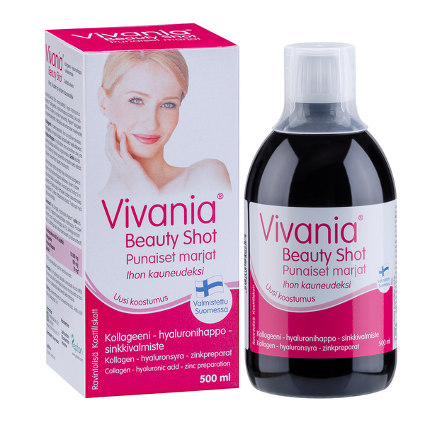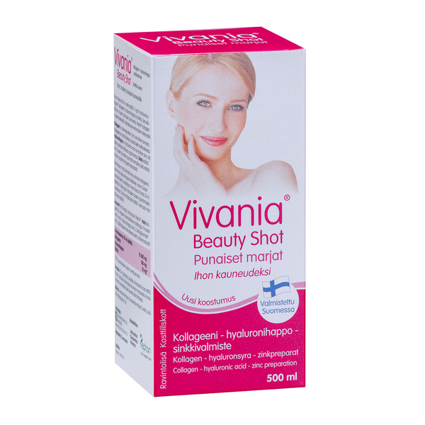 Vivania Beauty Shot -neste sisältää 1. tyypin hydrolysoitua Peptan® kollageenia, hyaluronihappoa ja sinkkiä, joka edistää ihon, hiusten ja kynsien hyvinvointia. Peptan® kollageeni on pienimolekyylistä, mikä takaa sen erinomaisen imeytyvyyden. Kollageeni on rakenneproteiini, ihon luonnollinen ainesosa. Kollageenia on myös hiuksissa, kynsissä sekä nivelkudoksessa. Hyaluronihappo on myös kehon oma luonnollinen aine, jota esiintyy kaikissa elollisissa organismeissa. Sinkki edistää ihon, hiusten ja kynsien pysymistä normaalina sekä edistää solujen suojaamista hapettumisstressiltä. Ikääntymisen myötä elimistön kyky valmistaa kollageenia kuten myös hyaluronihappoa heikkenee. Hyvien tulosten saavuttamiseksi suositellaan Vivania Beauty Shottia 50 ml päivittäin 4-8 viikon ajan. Parhaiden tulosten saavuttamiseksi suositellaan 12 viikon yhtäjaksoista käyttöä. Tuote sopii myös jatkuvaan käyttöön.