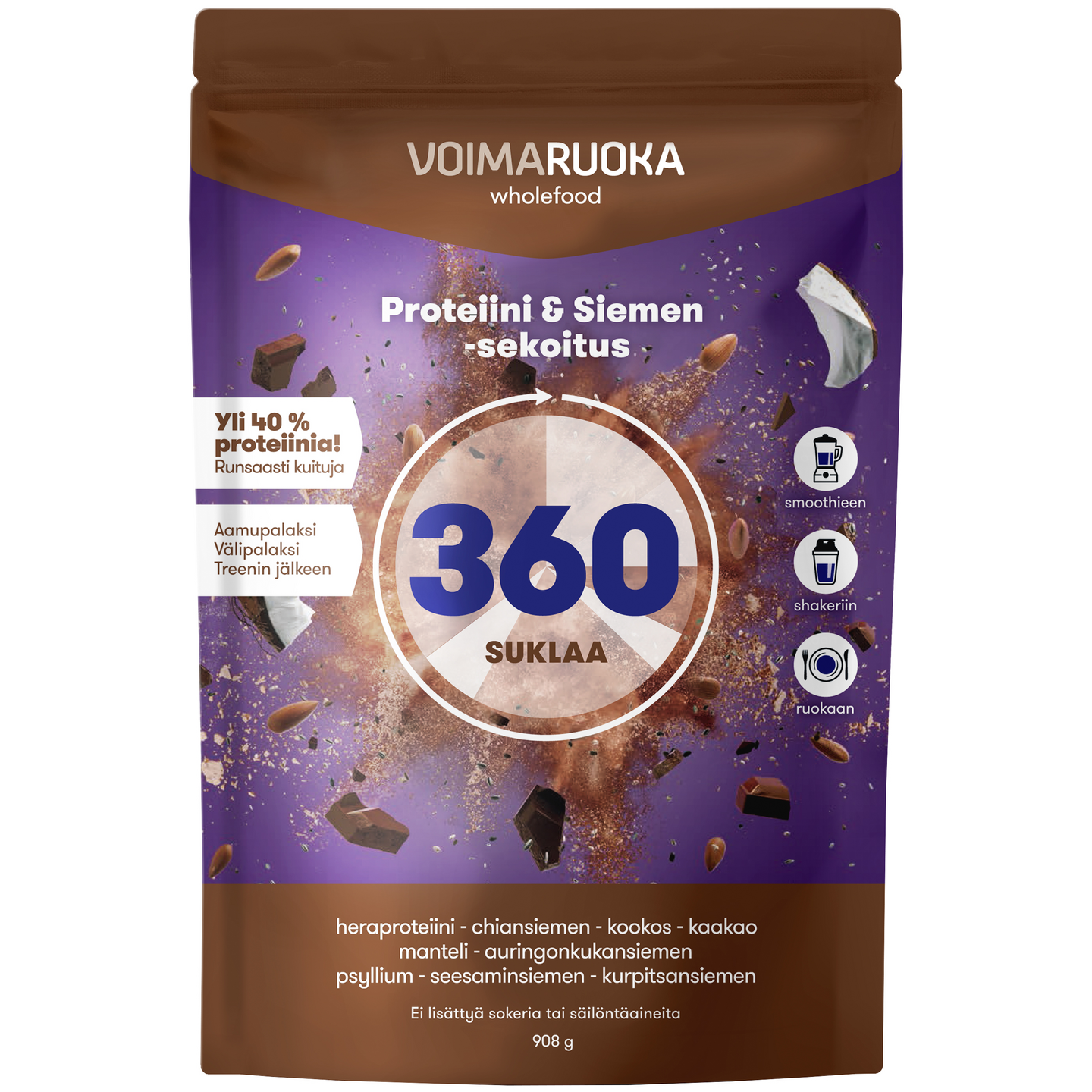 Voimaruoka 360 Wholefood Suklaa sisältää yli 40 % heraproteiinia, hyviä rasvoja, hiilihydraatteja, kuituja ja mineraaleja noin kymmenestä luonnon raaka-aineesta ilman lisättyä sokeria, säilöntäaineita tai gluteenia. Sopii päivittäiseksi aamupalaksi, välipalaksi ja treenijuomaksi.