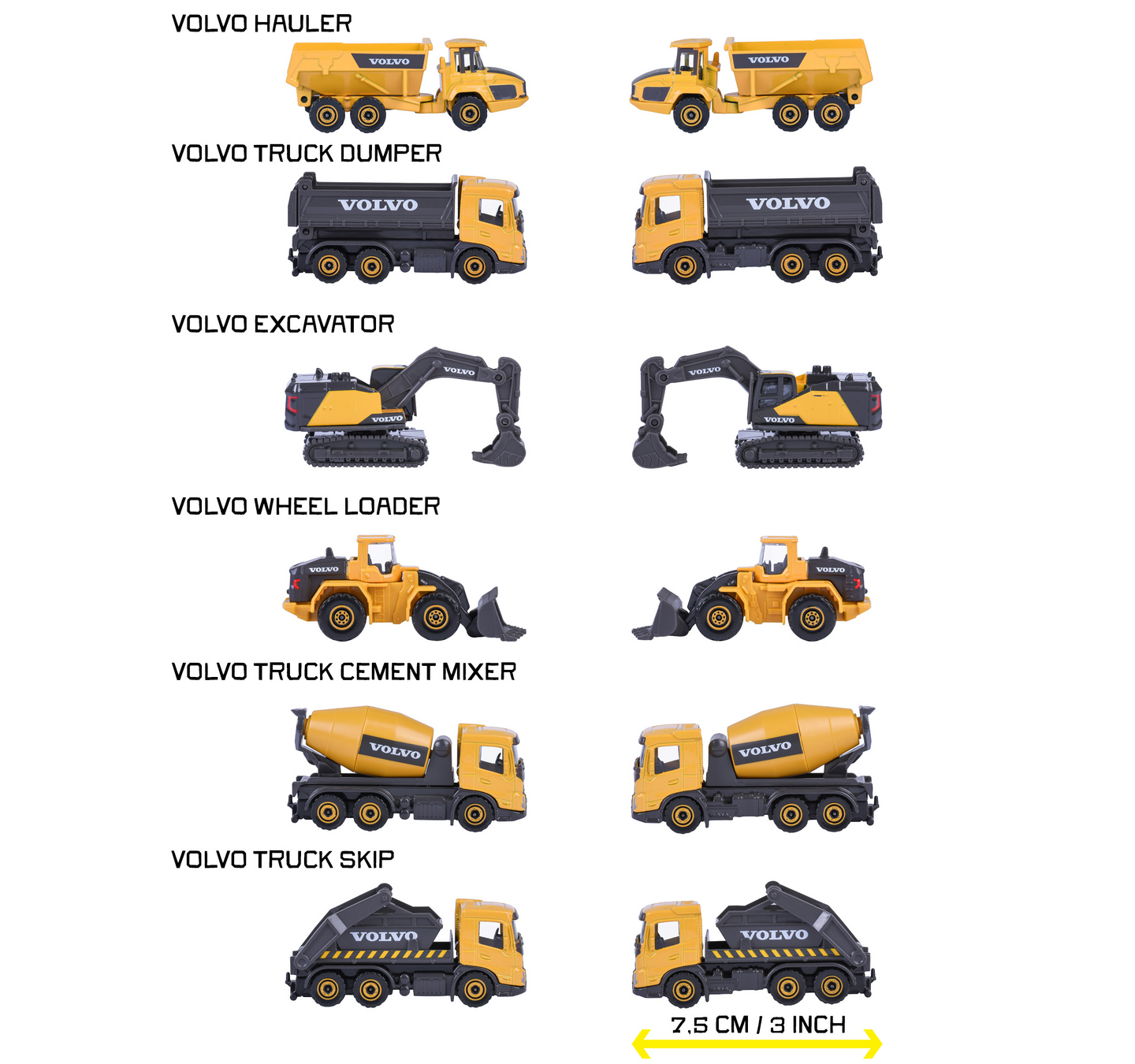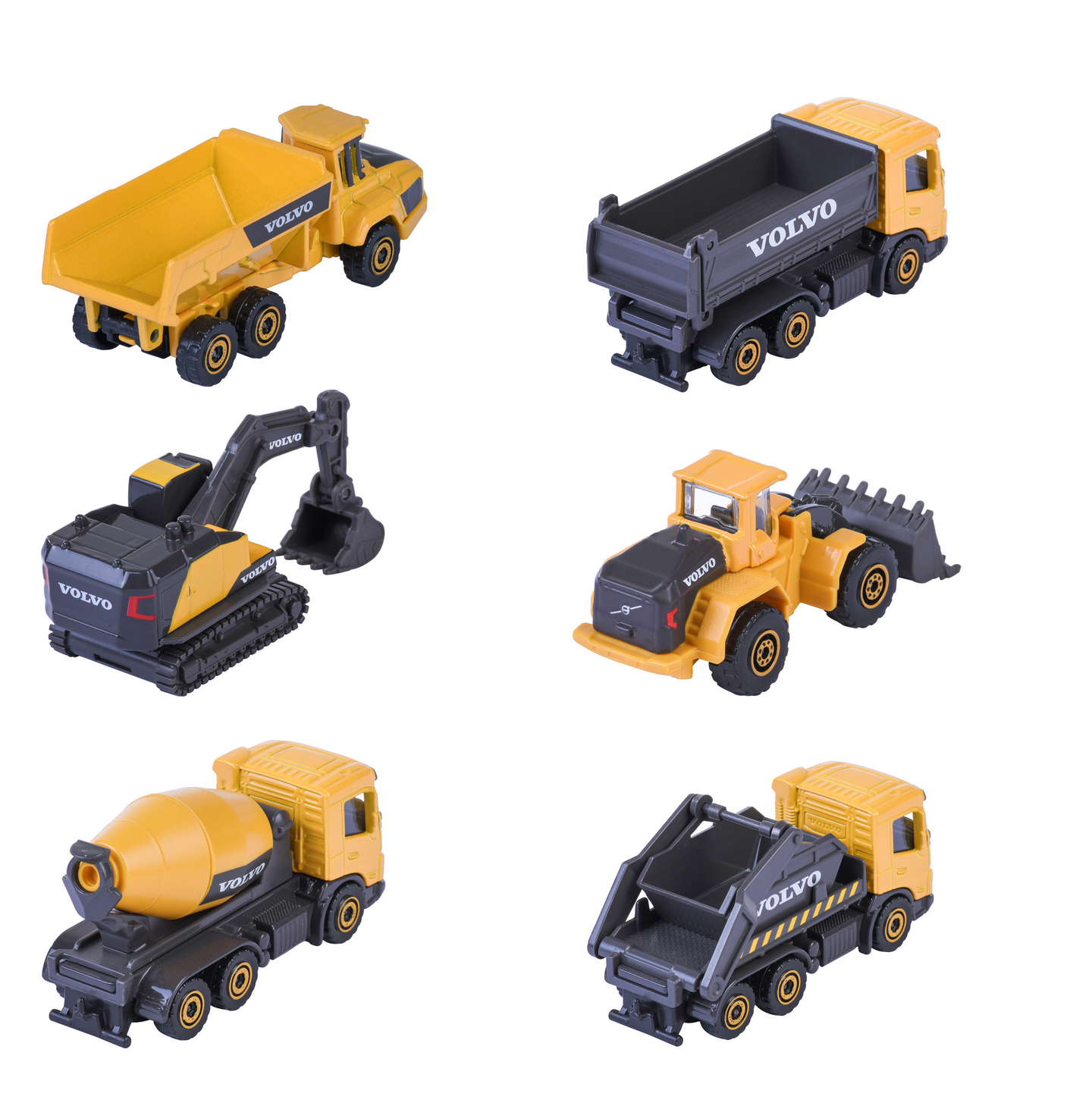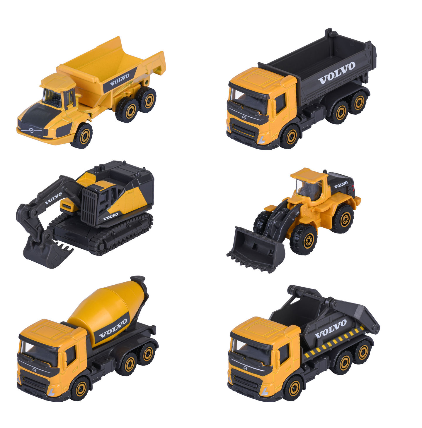 Majoretten Premium Volvo -sarjan metallivaletut (die-cast) työmaa-ajoneuvot luovat ja tuovat rakentamisen riemua leikkityömaille lastenhuoneeseen tai hiekkalaatikolle. Yksityiskohtainen muotoilu, liikkuvat osat ja vapaasti pyörivät renkaat tekevät näistä pikkukoneista täydellisiä niin leikkeihin kuin keräilyyn. Valittavana kaivinkone, pyöräkuormaaja, maansiirtoauto, betonimyllyauto, vaihtolava-auto tai kippiauto. Myydään yksittäin. Volvon virallisesti lisensoimia. Koko 7,5 cm. Sopii lapsille 3-vuotiaista alkaen.