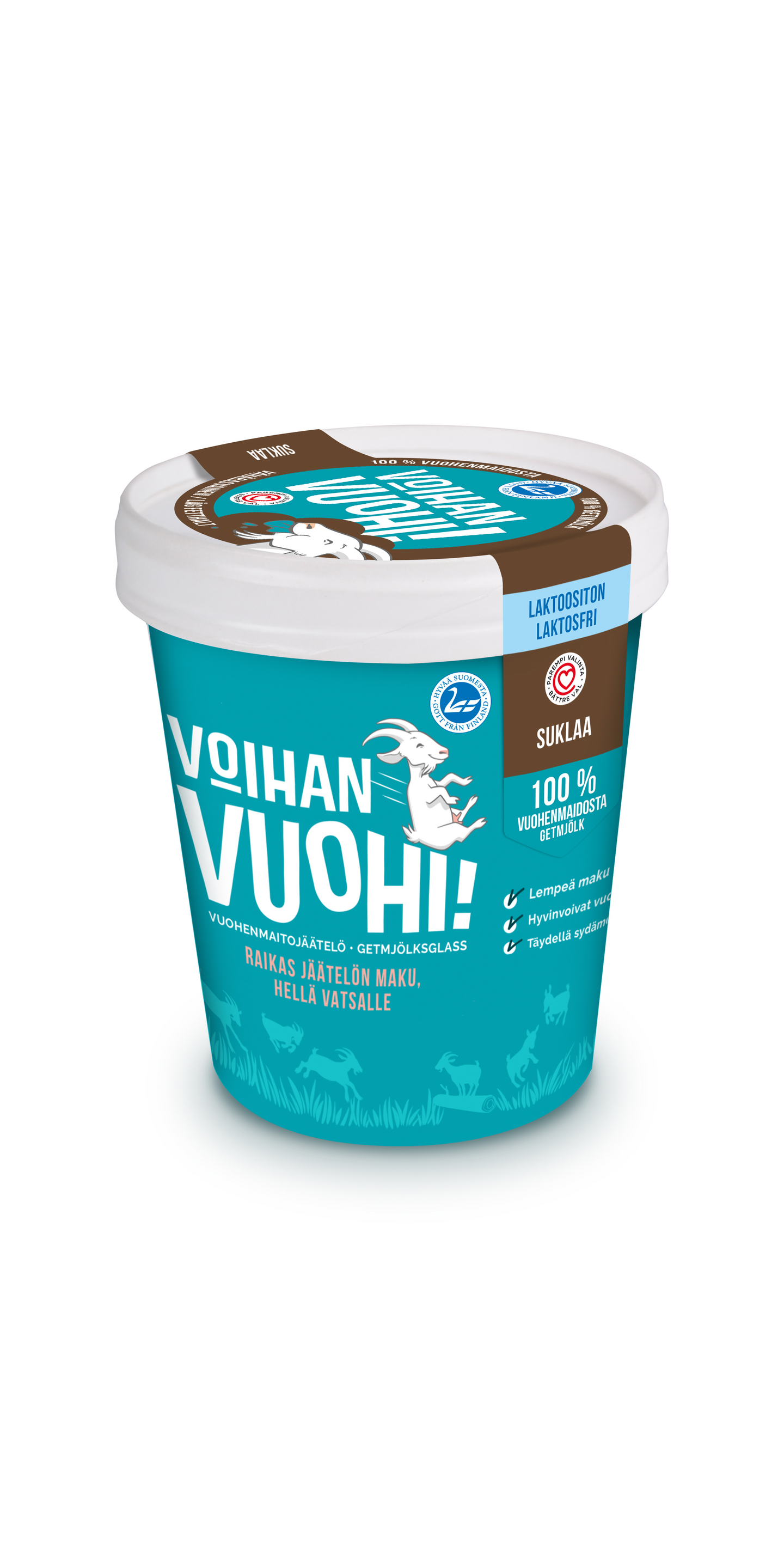 Puhtaasta kotimaisesta vuohenmaidosta valmistettu suklaajäätelö, jonka seassa on suklaapisaroita. Nam! Sydänmerkillä varustetut kotimaiset Voihan Vuohen jäätelöt takaavat kevyen herkkuhetken – mausta tinkimättä!