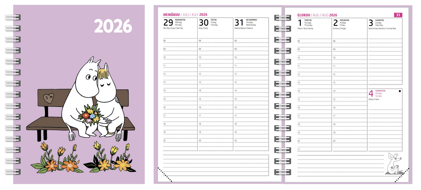 Taskuun ja pienempäänkin laukkuun sopiva Muumi A6-kalenteri. Tässä kartonkikantisessa vuoden 2026 kierresidotussa Muumi-kalenterissa on kolmikielinen viikkonäkymä 12 kuukauden sisällöllä. Kielet suomi, ruotsi ja englanti. Suomalaiset nimi- ja juhlapäivät. Löydät aukeamilta Muumi-hahmoja. Sisältää vuosisuunnitelman, liputuspäivät, suomenkieliset nimipäivät ja runsaasti viivoitettua muistiinpanotilaa. Valmistettu FSC-sertifioidusta paperista.
