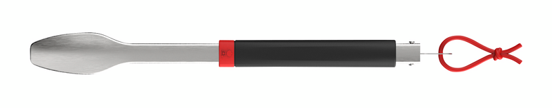 Lukitusmekanismi sulkee pihdit säilytystä varten, ja ne voi ripustaa grillin tarvikekoukkuun lenkin avulla.