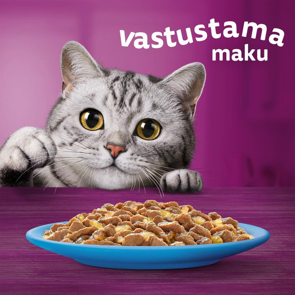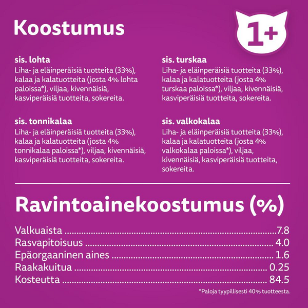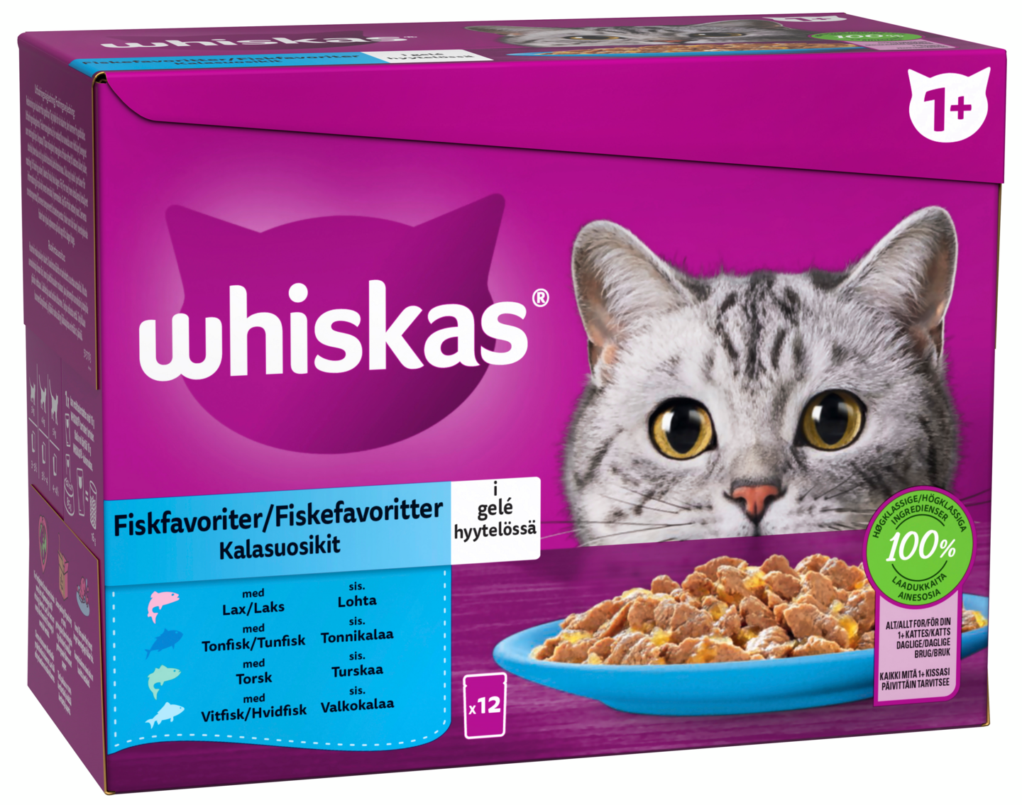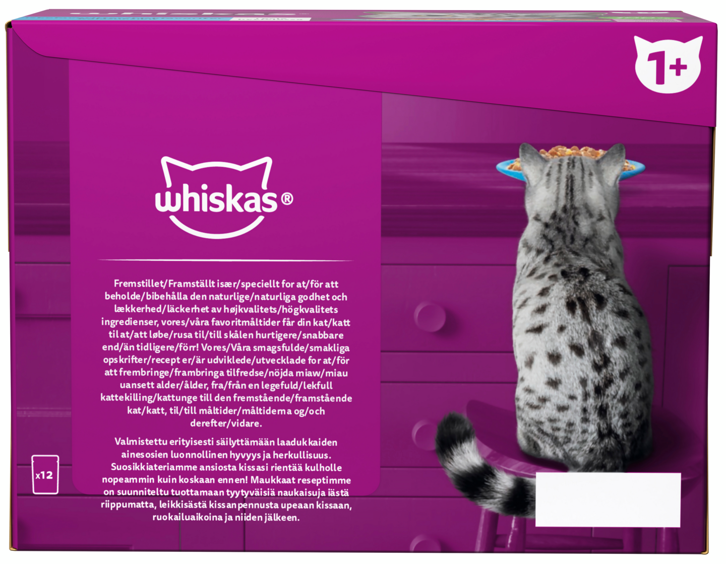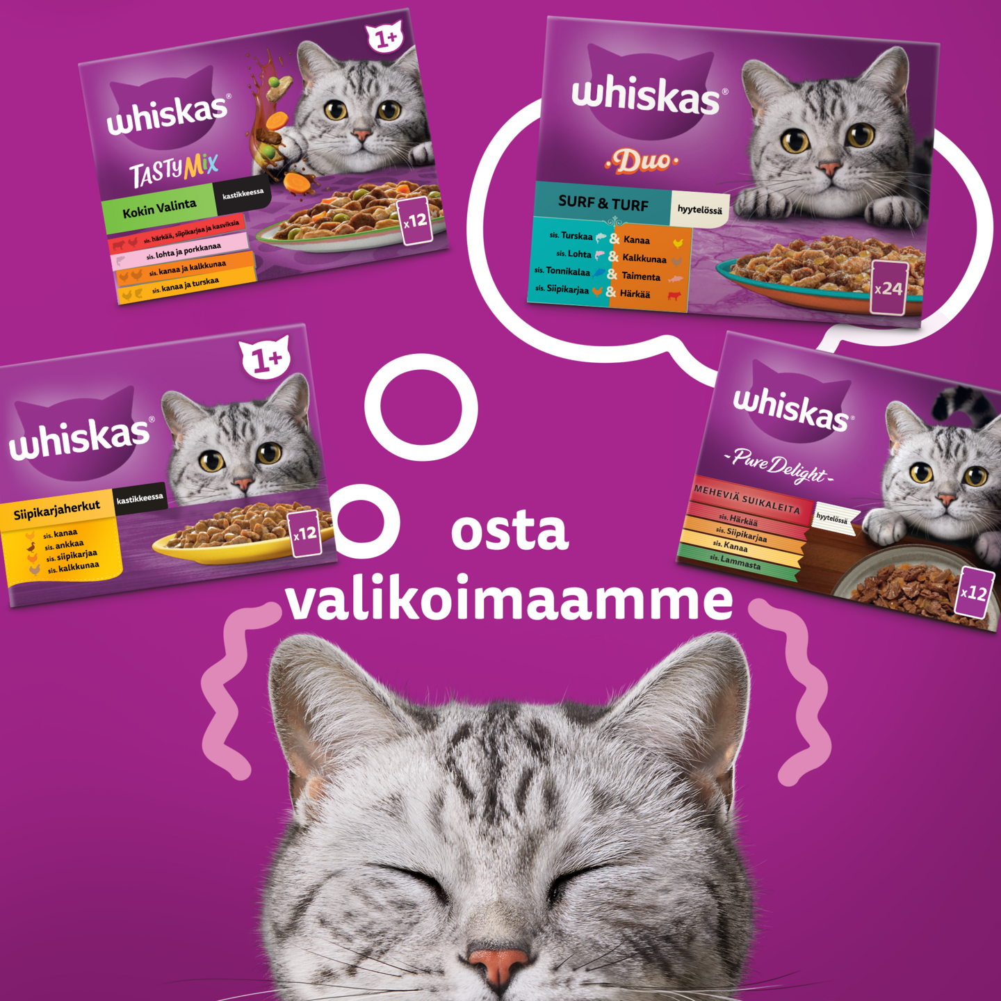 Whiskas 1+ reseptit sisältävät kaiken, mitä kissasi ravitsemuksellisesti tarvitsee pitkään ja onnelliseen elämään. Optimaalinen tasapaino vitamiineja ja kivennäisaineita. Edistää virtsateiden terveyttä. Lisätty sinkki auttaa tukemaan ihon ja turkin hyvinvointia. Tasapainoinen energiasisältö painonhallintaan.