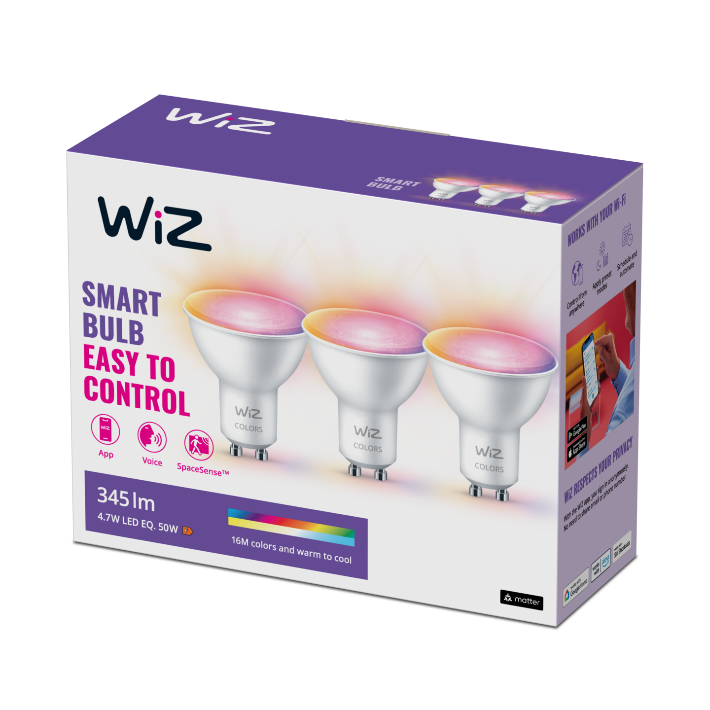 WiZ LED GU10-kantainen väriä toistava full color -kohdelamppu tuo älykkään valaistuksen elämääsi. Ihanteellinen korostamiseen ja kohdevalaistukseen. Luo haluamasi tunnelma lampun 16 miljoonan värin ja lämpimästä viileään säädettävän valkoisen valon avulla. Voit ajastaa valot syttymään ja sammumaan päivittäisten tai viikoittaisten rutiiniesi mukaan, ohjata valaistusta älypuhelimella tai äänellä ja säätää valaistusta etänä myös poissa ollessasi. WiZ-valot voi yhdistää nykyiseen Wi-Fi-verkkoosi ilman lisälaitteita. Pakkaus sisältää 3 lamppua.
