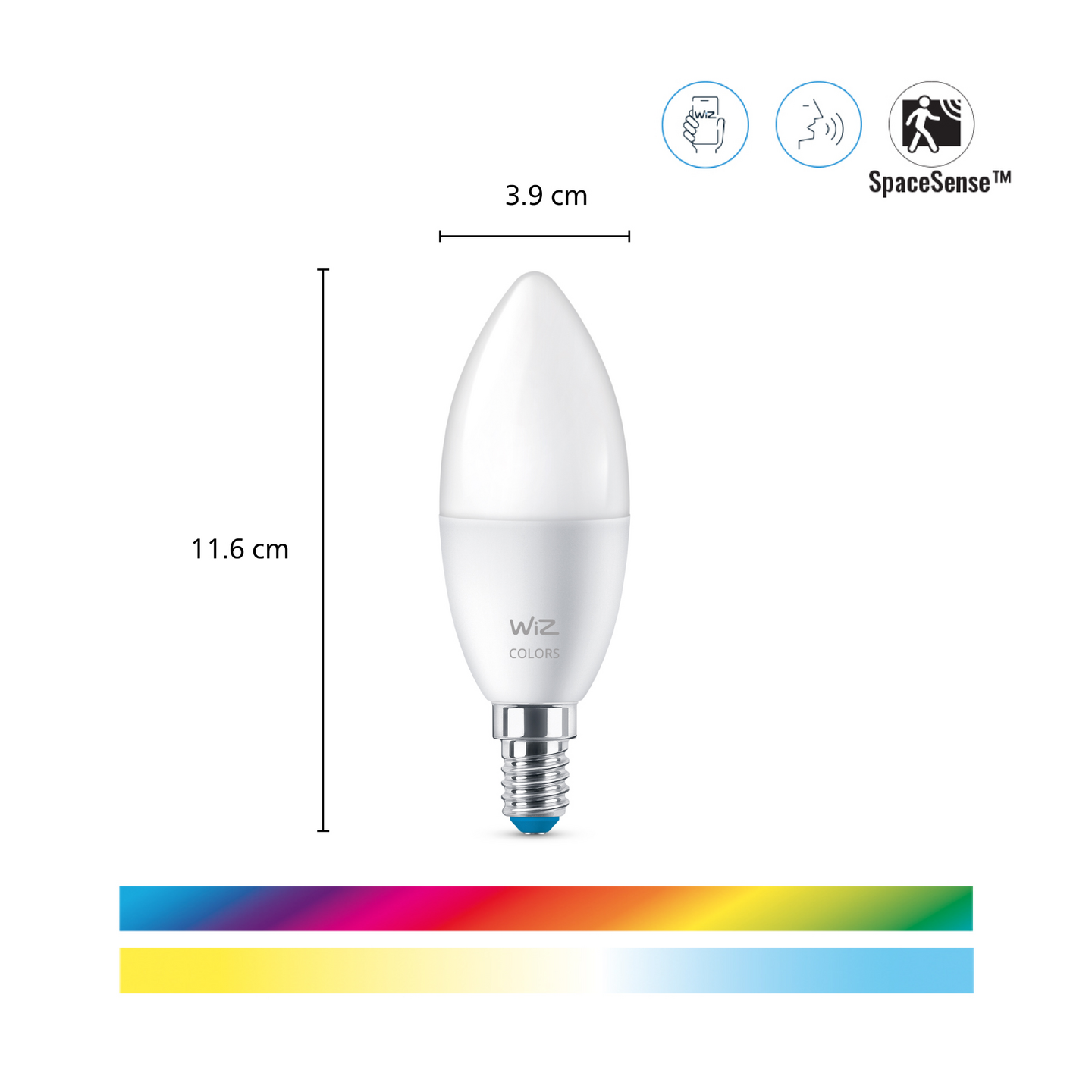WiZ full color -älylamppu valaisee kotisi upealla värikkäällä valolla. E14-kantainen kynttilälamppu sopii kattokruunuihin ja pieniin valaisimiisi tuottaen laadukkaan LED-valaistuksen. Valittavanasi on 16 miljoonaa eri värisävyä, ja voit myös muuttaa lampun värilämpötilaa.