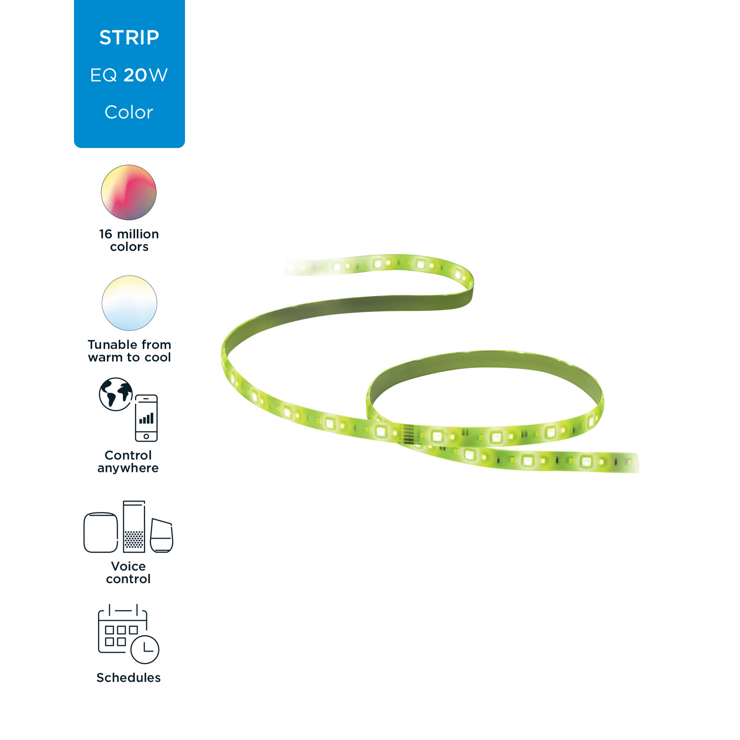 Nauti Circadian Rhythm -toiminnosta (Vuorokausirytmi), jonka ansiosta valaistus mukailee vuorokaudenrytmiä muuttaen valaistustasi viileän kirkkaasta valosta lämpimämpiin sävyihin päivän aikana, mikä parantaa myös hyvinvointiasi. Koe myös, kuinka dynaamisten valotilojen ansiosta kotisi kylpee upeissa värikkäissä valotehosteissa, jotka jäljittelevät mm. meren aallokkoa tai tulen loimua luoden ainutlaatuisen tunnelman arjen hetkiin. Aloituspakkaus sisältää 2 metrin valonauhan, jota voidaan pidentää jopa 10 metriin jatkonauhalla (myydään erikseen).