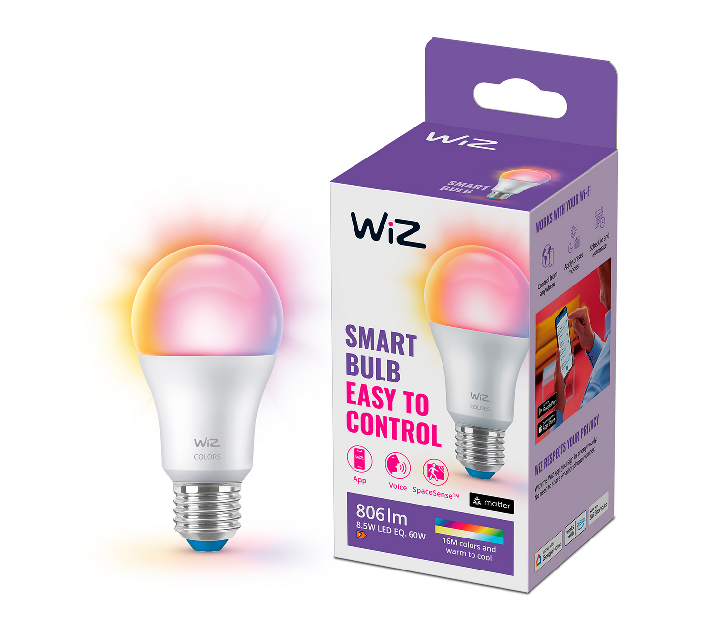 WiZin väriä toistava full color -älylamppu valaisee kotisi upealla värikkäällä valolla. E27-kantainen älylamppu muistuttaa ulkomuodoltaan perinteistä hehkulamppua, ja se sopii nykyisiin valaisimiisi. Valittavanasi on 16 miljoonaa eri värisävyä, ja voit myös muuttaa lampun värilämpötilaa.
