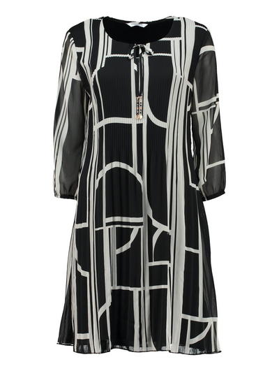 Tyylikäs mekko ,jossa pliseerattu ohut kangas ja trikoinen vuori. Mekko levenee hieman alaspäin. Hihat läpikuultavat. Tämä mekko käy myös juhlavampaan käyttöön. Reilu malli ,joka sopii monille vartalotyypeille. Yksityiskohtina kauniit korumaiset nauhat edessä
