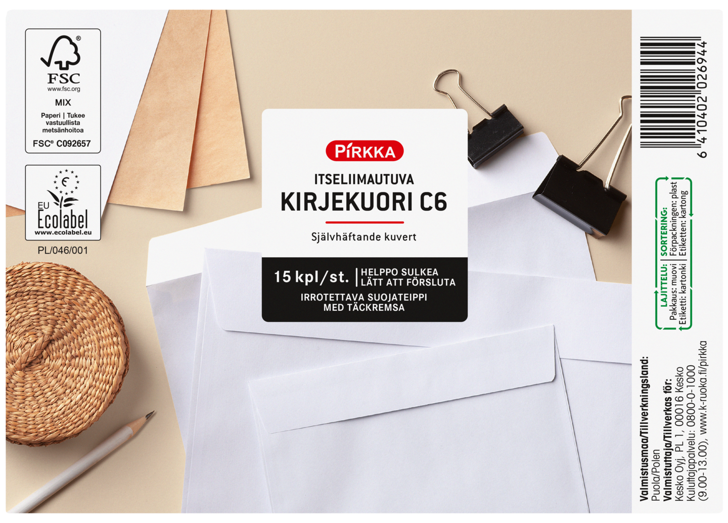 Pirkka itseliimautuva kirjekuori C6 15kpl