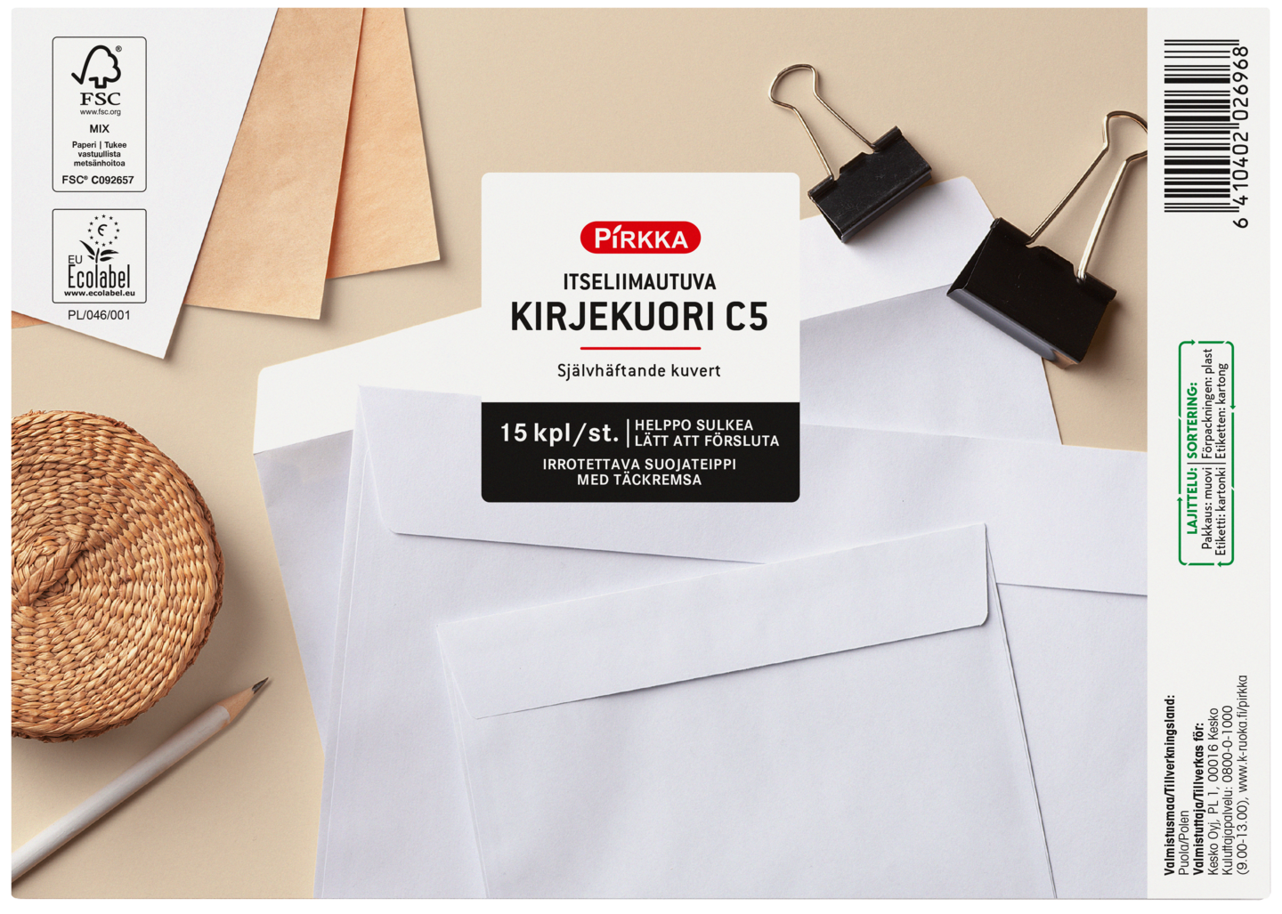 Pirkka itseliimautuva kirjekuori C5 15kpl
