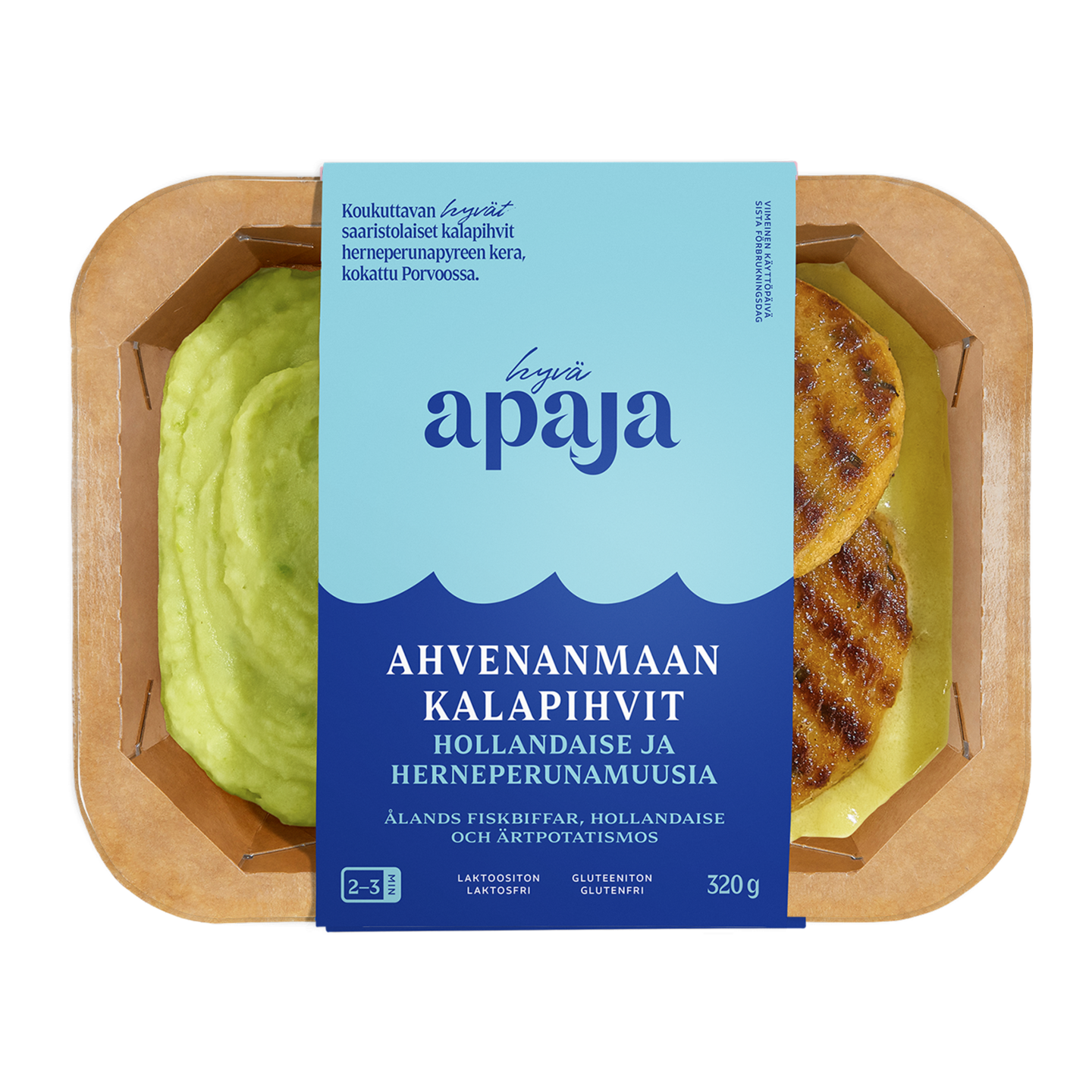 Hyvä Apaja Ahvenanmaan kalapihvit ja herne-perunamuusi hollandaisekastikkeen kera 320g