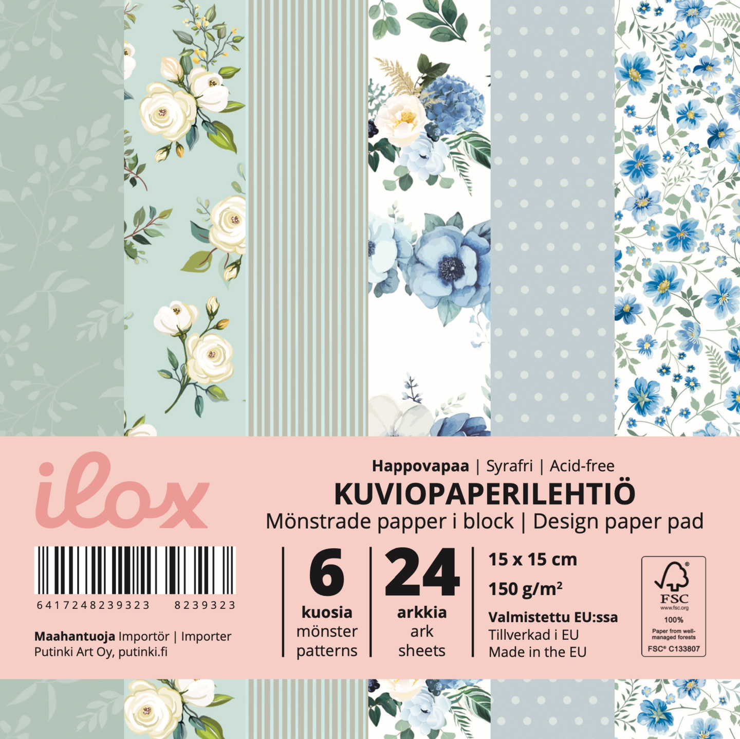 ILOX kuviopaperilehtiö Pikkukukat 15x15 cm, 24 arkkia sininen