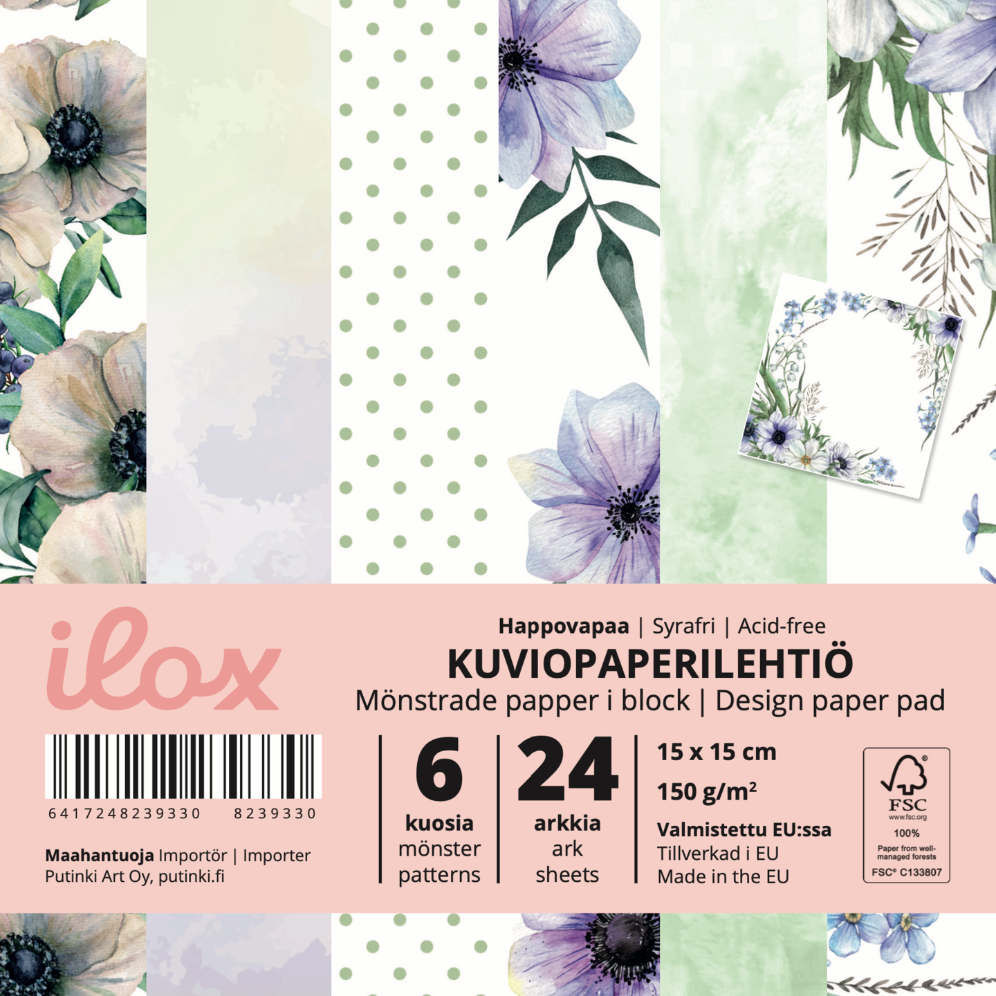 ILOX kuviopaperilehtiö Anemone 15x15 cm, 24 arkkia sininen