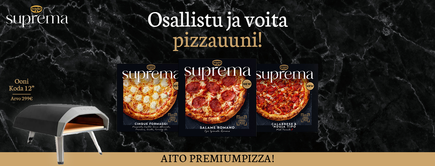 Kerro mikä Dr. Oetker Suprema-pizzoista on suosikkisi ja voit voittaa Ooni Koda 12 -pizzauunin. Palkinnon arvo 299€.