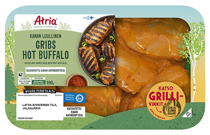 Atria Kanan Gribs Hot Buffalo tarjoilee mehevää paistiosaa ja sopivasti potkua lautaselle. Gribsit valmistuvat grillissä noin 20–30 minuutissa ja sopivat loistavasti kiireettömään herkutteluun – helppoja, maukkaita ja aina onnistuvia.