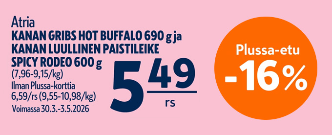Ostamalla Atria Kanan Gribs Hot Buffalo 690 g tai Kanan Luullinen Paistileike Spicy Rodeo 600 g K-Supermarketista 30.3.-3.5.2026 ja käyttämällä Plussa-korttia oston yhteydessä, olet mukana arvonnassa.