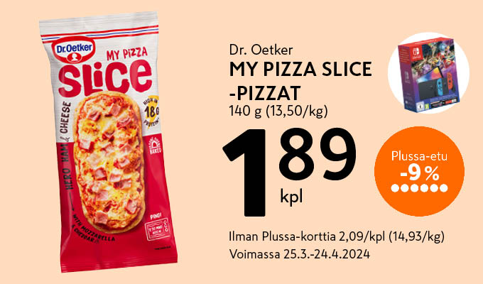 Ostamalla My Pizza Slice -pizzan 140g K-Marketista 25.3.–24.4.2024 ja käyttämällä Plussa-korttia oston yhteydessä, voit voittaa Nintendo Switch OLED Mario Kart 8 Deluxe Edition –pelikonsolin, arvo n. 400 €. Arvomme 5 palkintoa.