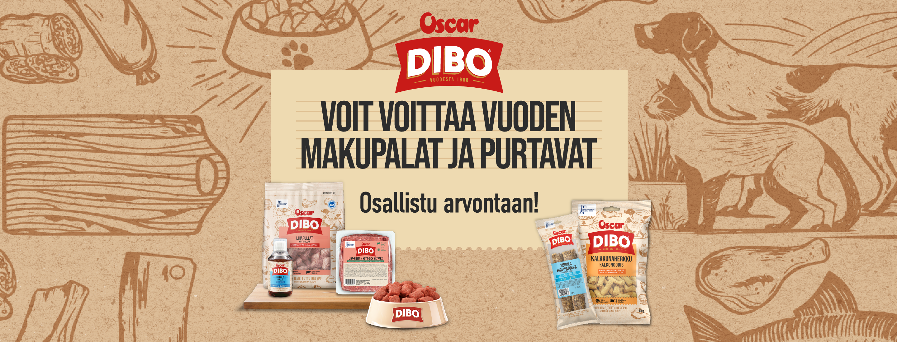 Uudistuneen ilmeen kunniaksi arvomme vuoden herkullisimmat palkinnot lemmikillesi. Kerro mikä DIBO- herkku saisi koirasi hännän heilumaan tai kissasi kehräämään. Osallistu arvontaan vastaamalla arvontakysymykseen ja jättämällä yhteystietosi. Pääpalkintona arvomme 200 € edestä DIBO- tuotteita sekä 5 kpl DIBO-tuotepaketteja (arvo 50 € / paketti).