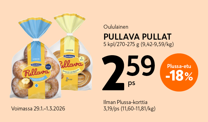 Ostamalla Oululaisen Pullava 5 kpl pullapussin 270-275 g 29.1.-1.3.2026 ja käyttämällä Plussa-korttia oston yhteydessä, olet mukana arvonnassa ja voit voittaa Staycation-lahjakortin kahdelle henkilölle Lapland-kaupunkihotelliin. Arvo 379 €. Arvomme 4 palkintoa. Voittajille ilmoitetaan henkilökohtaisesti.