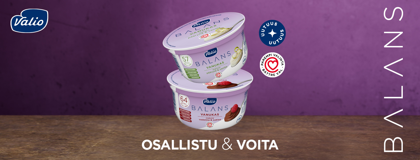 Arjen keskellä elämä on välillä melkoista tasapainottelua. Valio Balans -tuotteet tuovat helppoutta välipalavalintoihin yhdistäen erinomaisen maun sekä hyvän ravintosisällön. Muun tuoteperheen tapaan uudet Valio Balans -vanukkaat on suunniteltu syömisen pitkäjänteiseen tasapainottamiseen ja ne löytyvät kaupoista vadelma-suklaan ja päärynä-vaniljan makuisina.