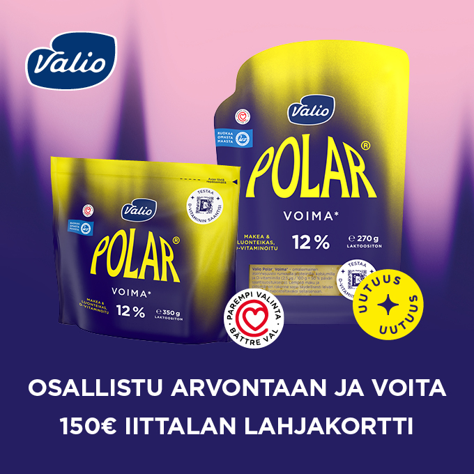 Valio Polar® Voima* on omaleimainen asennejuusto runsaalla proteiinilla, kalsiumilla ja D-vitamiinilla (2,5 µg / 100 g = 50 % päivän saantisuosituksesta). Juuston lempeä maku ja pitsimäinen rakenne sopii täydellisesti leivän päälle tai naposteltavaksi sellaisenaan. Valio Polar® on saanut innoituksensa pohjoisesta luonnosta, joka ei tunne kompromisseja. Se on juusto, jonka maku on samaan aikaan voimakas ja lempeä.