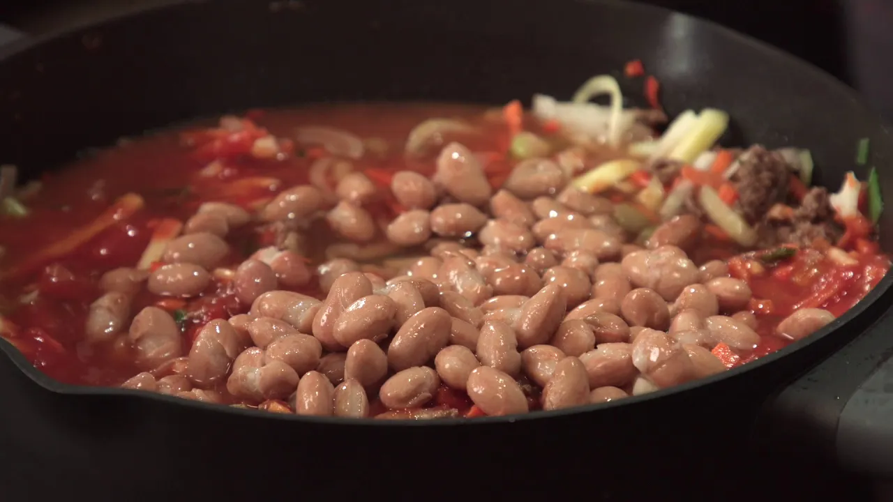Paahda jauheliha pinnoitetussa kattilassa. Sekoita joukkoon sipulit, chili ja lehtiselleri. Anna hautua kannen alla muutama minuutti.