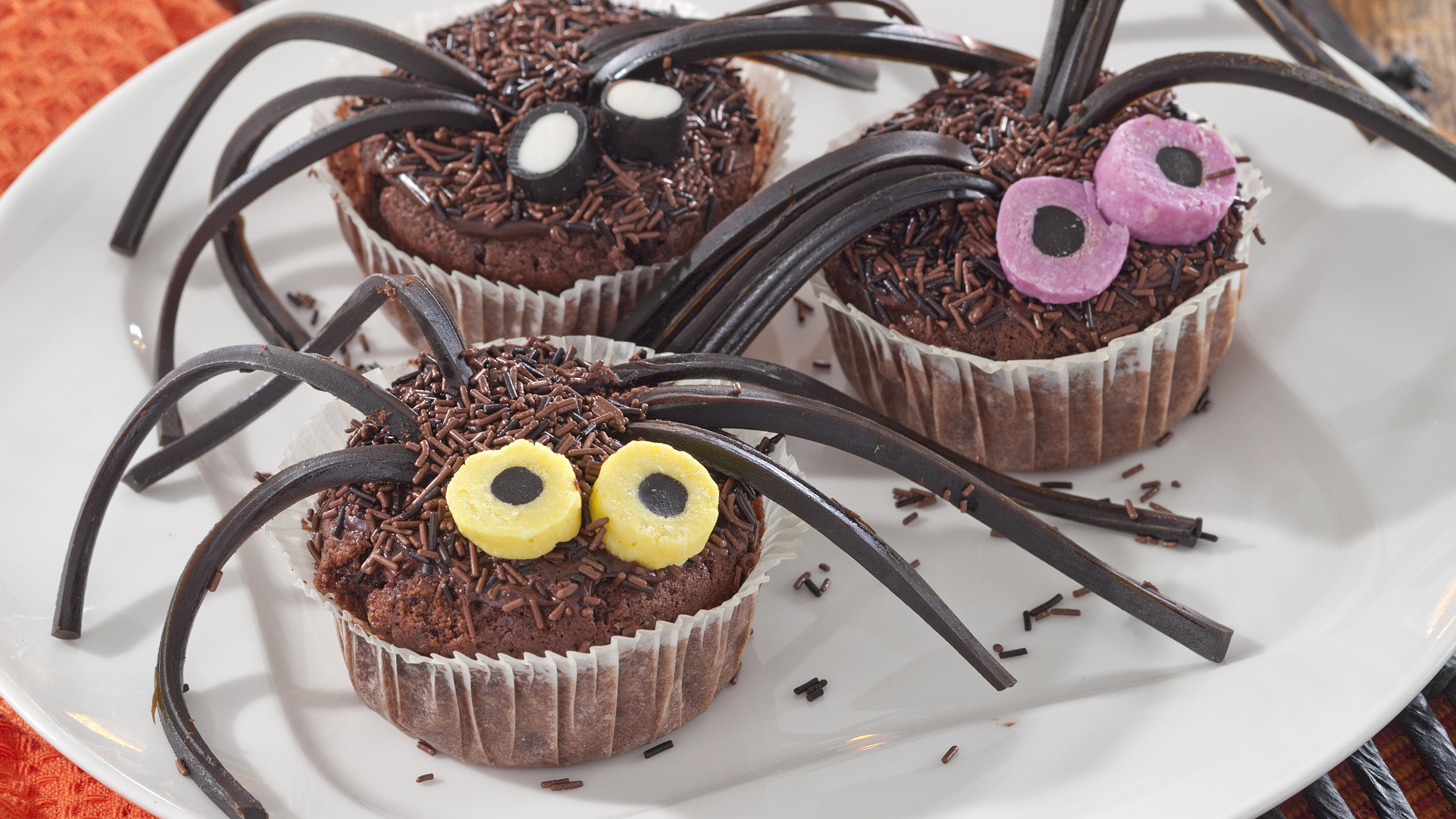 Tosi helpot suklaamuffinit muuttuvat karkkien avulla halloweenin hauskimmiksi hämähäkeiksi! Nämä halloweenherkut ilahduttavat erityisesti perheen pienimpiä.