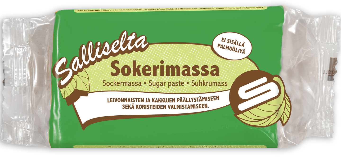 Sekoita sokerimassat keskenään käsissä tasaiseksi, kunnes ne muodostavat tasaisen oranssin massan. Kauli massa suureksi (Ø noin 30 cm), pyöreäksi levyksi. (Käytä tomusokeria apuna tarvittaessa.) Nosta levy tuorekelmun päälle ja nosta se pyöreäpohjaiseen suureen (Ø 23 cm ja tilavuus 3,5 l) kulhoon. Painele levy kulhon reunoja vasten.
