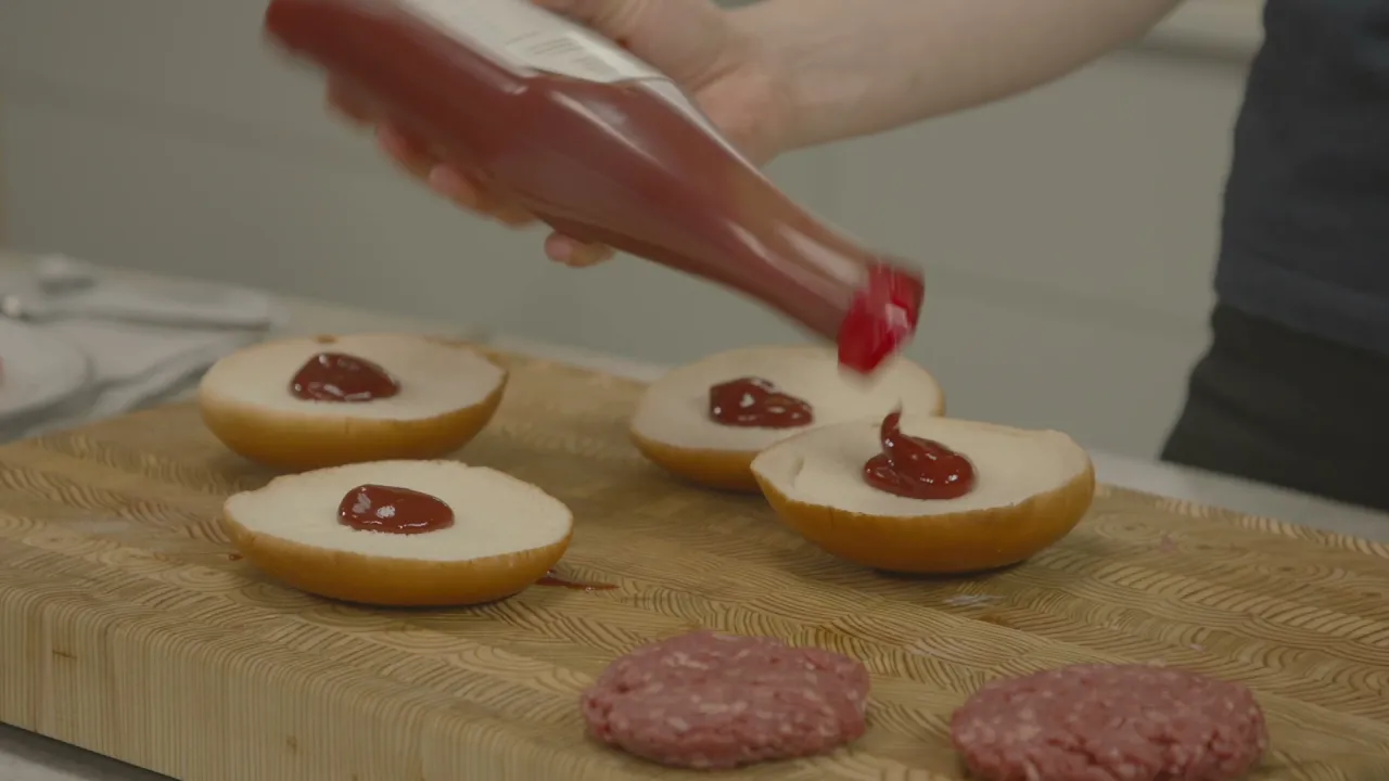Levitä ketsuppia sämpylöiden hatuille. Täytä hampurilainen hatun päälle ja lisää hampurilaiskastike.