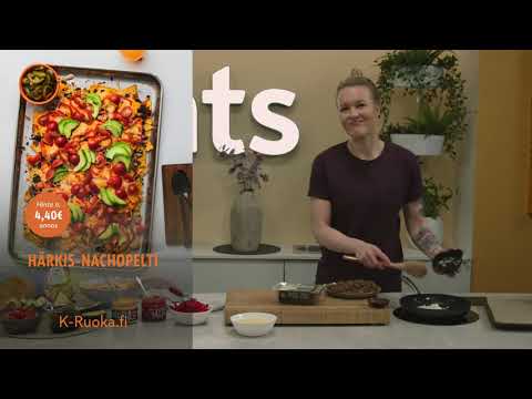 Levitä maissilastut leivinpaperin päälle pellille. Levitä maissilastujen päälle salsadippi, Härkisseos, juustodippi ja paprikaviipaleet. Ripottele pinnalle juustoraaste.