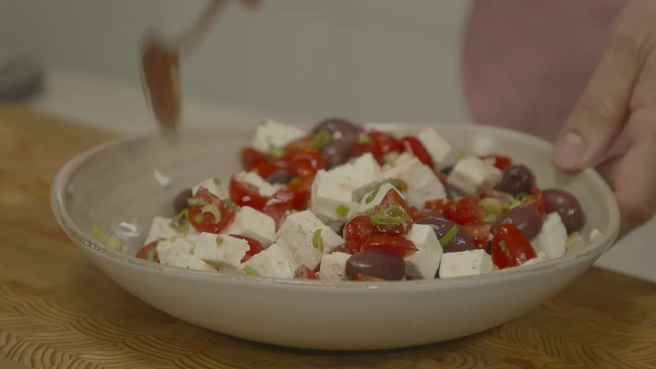 Vaihe 2 tehty 2 Leikkaa feta kuutioiksi. Leikkaa pestyt miniluumutomaatit neljään osaan. Valuta oliivit. Hienonna kevätsipuli. Sekoita täytteen ainekset keskenään.