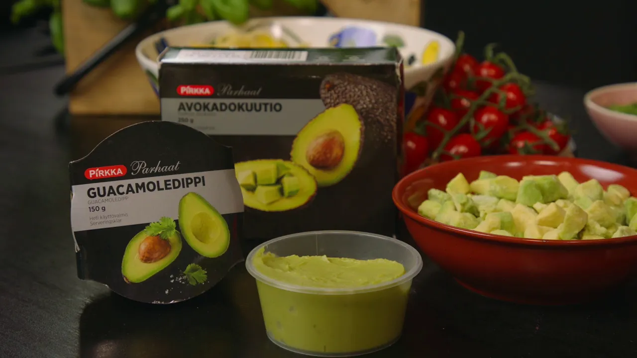 Vinkki! Voit käyttää pastaan myös tuoretta avokadoa. Halkaise kaksi (400 g) avokadoa, poista kivet ja kuutioi hedelmäliha. Lisää avokadokuutiot pastan sekaan yhdessä guacamoledipin kanssa.