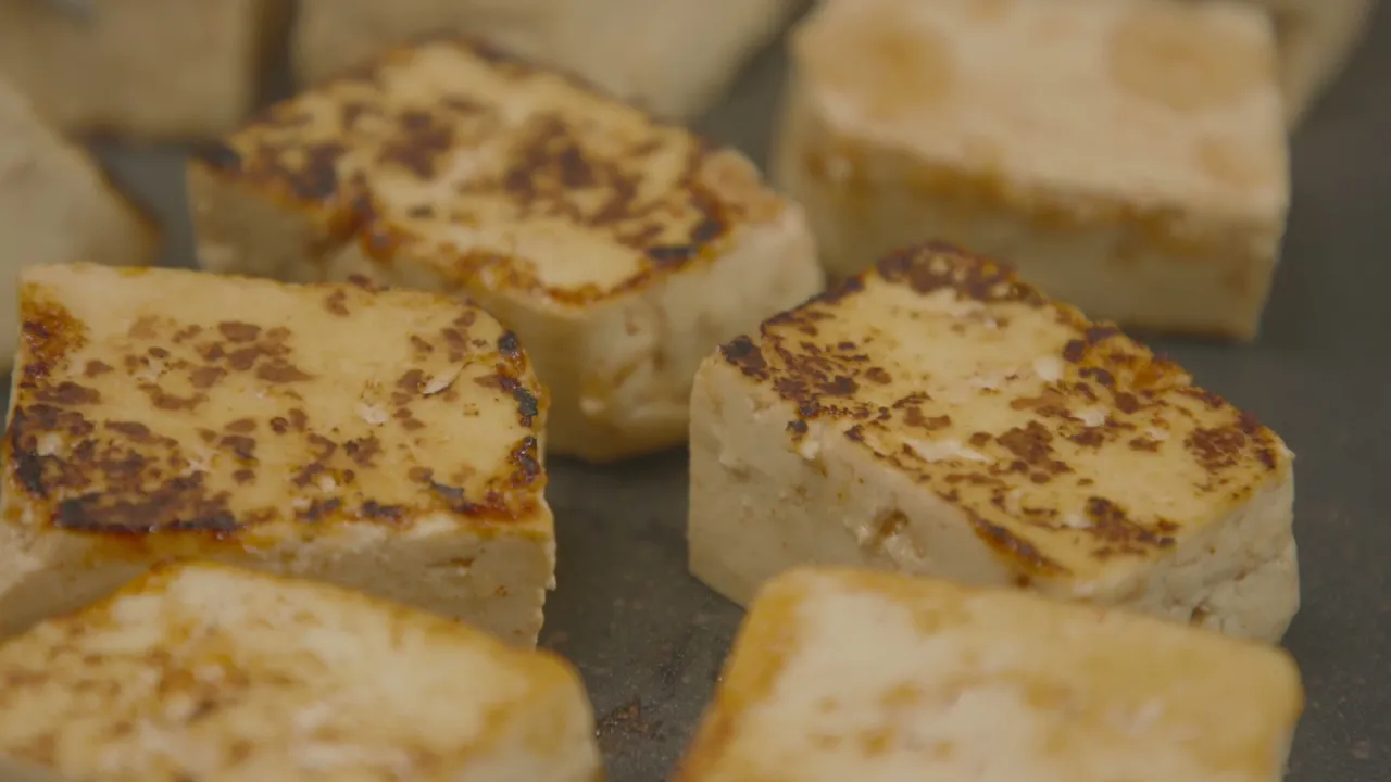 Kuivaa tofu talouspaperilla tai puhtaalla keittiöpyyhkeellä. Leikkaa tofu pitkittäin kahtia ja tämän jälkeen vielä uudestaan pitkittäin halki. Leikkaa palat vielä keskeltä kahteen osaan. Tofuviipaleet pysyvät näin leikattuina paremmin kasassa.
