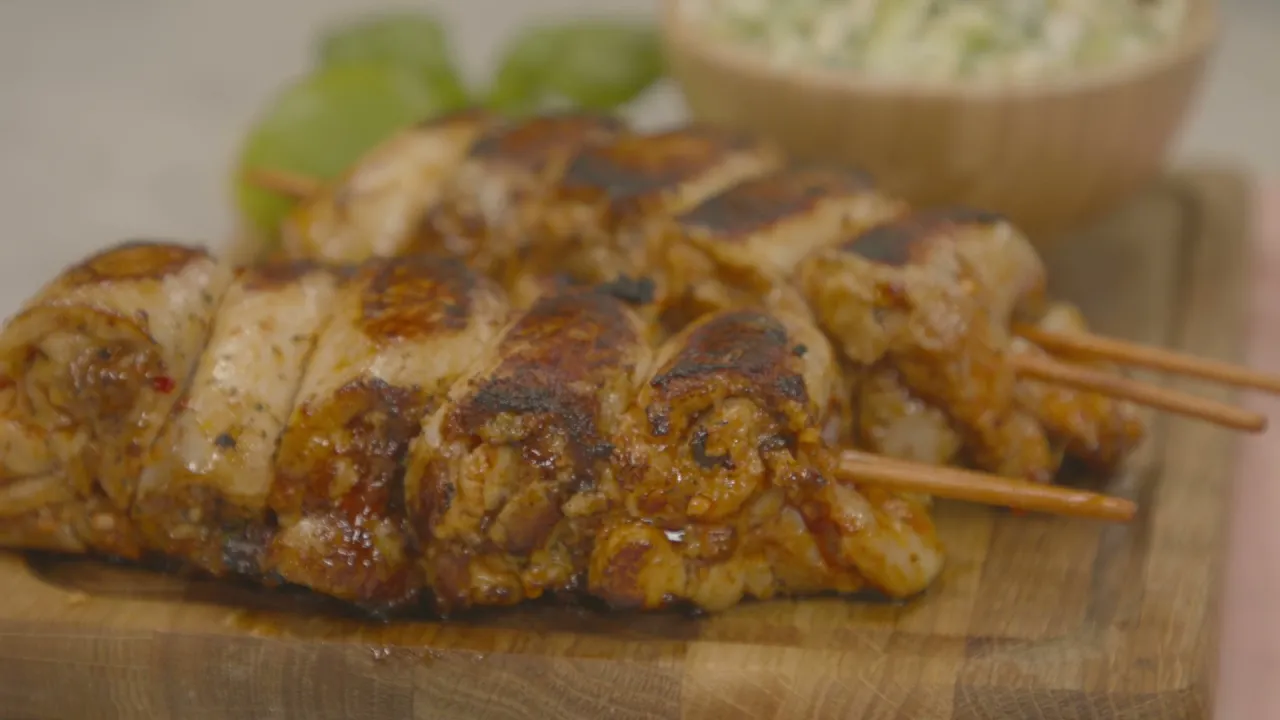 Valmiiksi marinoidut amerikkalaistyyliset kanavartaat valmistuvat helposti grillissä tai uunissa. Täyteläinen ranch coleslaw on täydellinen lisäke kesän grilliruoille!