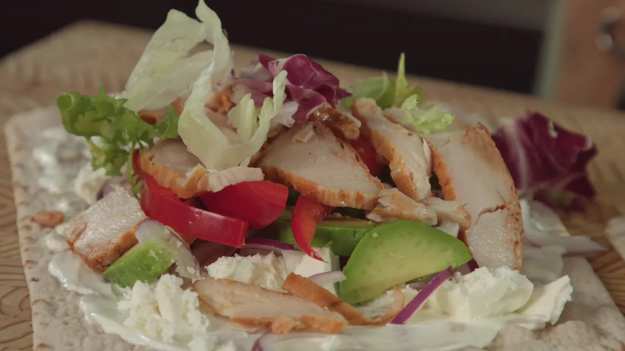 Sivele wrapit ranskankermalla. Täytä kanalla, paprikalla, avokadolla sekä halutessasi punasipulilla. Mausta mustapippurilla. Murenna täytteeseen salaattijuustoa. Lisää lopuksi ohut kerros salaattisekoitusta ja valuta tacokastiketta pinnalle tasaisesti.
