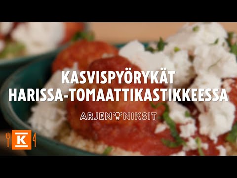 Arjen kasvisruoka on alle vartissa valmis, kun tarjoat kasvispyörykät helpossa tomaattikastikkeessa. Harissa, feta ja minttu vievät annoksen makumaailman lähi-idän suuntaan.