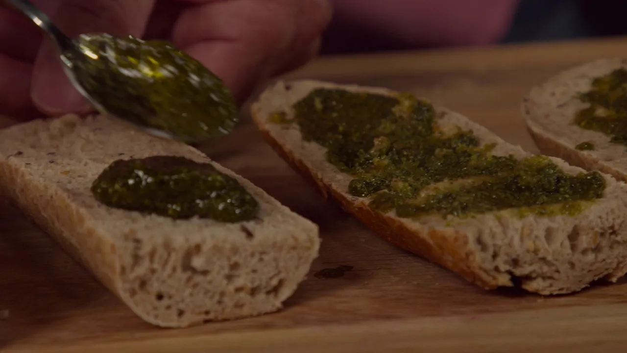 Vaihe 4 tehty 4 Voitele patongit pestolla ja nosta uunivuokaan. Jaa lihapullakastike patonkipaloille ja ripottele pinnalle juustoraaste.