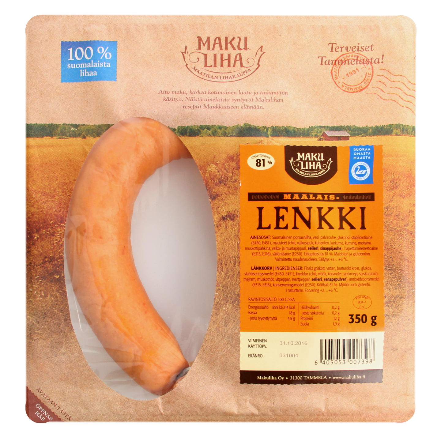 Kuori lenkki ja leikkaa kuutioiksi. Ruskista makkarat ja sipulit kevyesti öljyssä. Ripottele päälle vehnäjauhot, sekoita ja lisää tomaattimurska sekä vesi.
