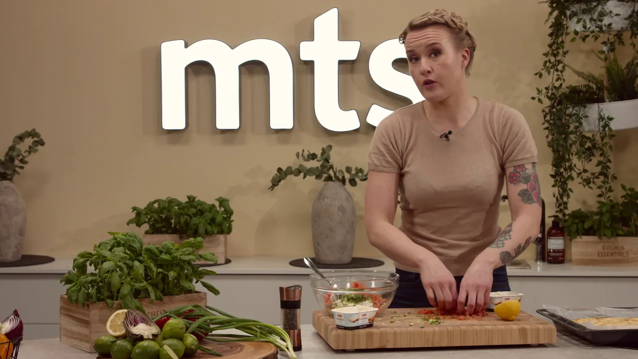 Hienonna graavi- tai kylmäsavulohi ja kevätsipulin varret (noin 2 dl). Sekoita kaikki täytteen ainekset keskenään.