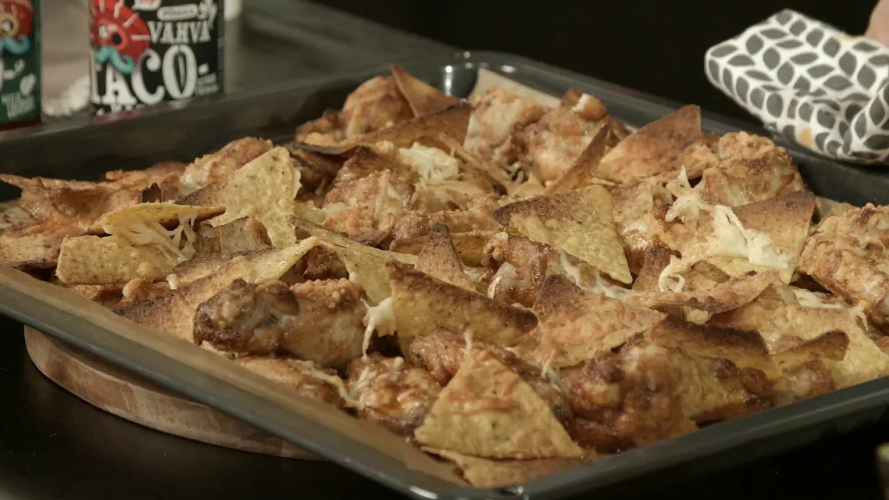 Illanistujaisten tai kisakatsomon helpoin tarjottava on tässä! Yhdistä kaksi suosikkiruokaa nachot ja wingsit samalle pellille. Herkkupellistä riittää jaettavaa isommallekin porukalle.