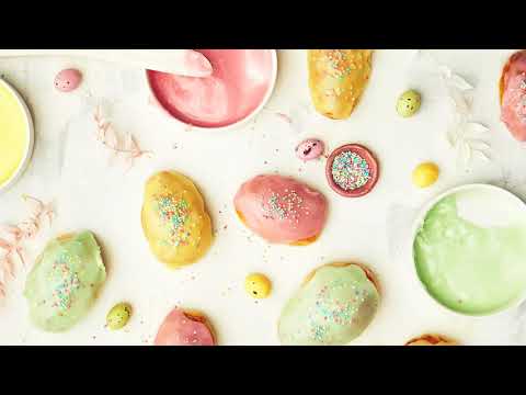 Sekoita kuorrutuksen aineet keskenään tahnaksi. Jaa kolmeen osaan ja värjää kuorrutteet erivärisiksi. Lisää tarvittaessa tomusokeria tai vettä. Kasta pullat yksitellen eri kuorrutteisiin. Ripottele nonparelleja pullien päälle.