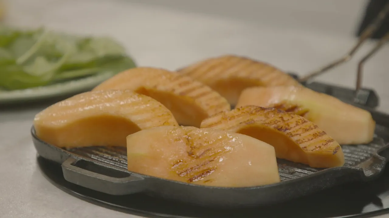 Lohko ja kuori cantaloupemeloni. Sivele öljyä lohkojen pinnalle.