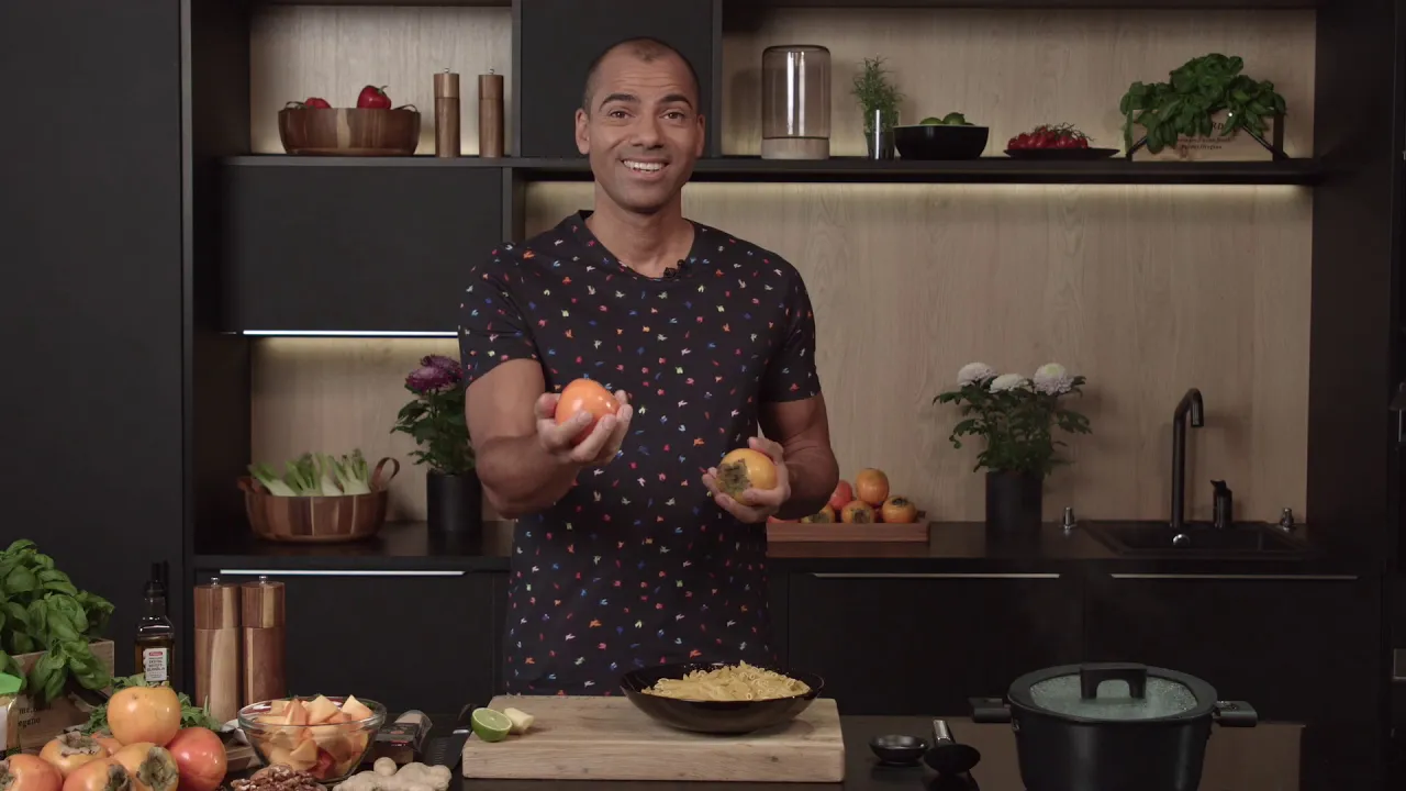 Kuori persimonit ja viipaloi ne muutamaan osaan. Kuori ja raasta inkivääri. Mittaa kaikki kastikkeen ainekset tehosekoittimen kannuun ja soseuta tasaiseksi.