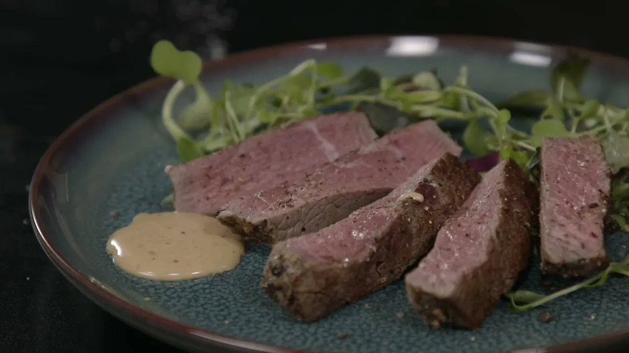 Laita pihvit lopuksi paistumaan 150 asteiseen uuniin noin 8 minuutiksi. Kun haluttu kypsyys on saavutettu ota pihvit pois uunista ja anna niiden vetäytyä leikkuulaudan päällä lämpöisessä paikassa 10 minuuttia. Tarjoa pihvit kermakastikkeen kanssa.